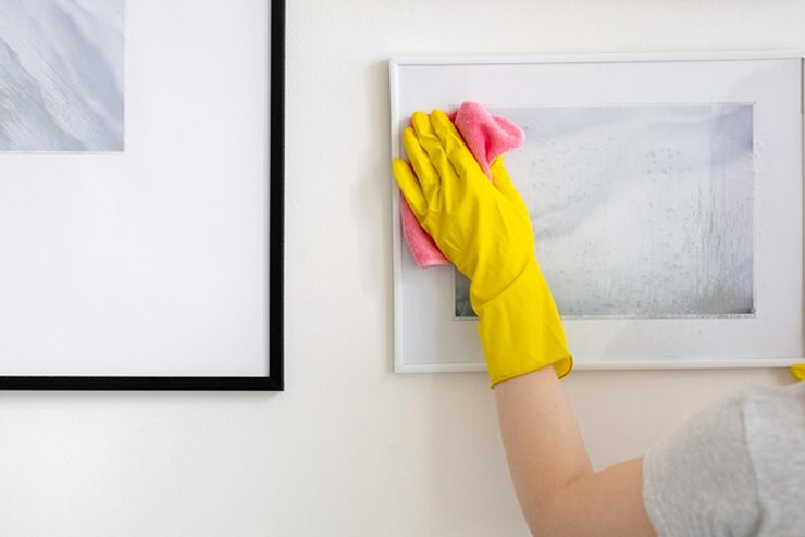 Cleaning interior windows, glass partitions, and glass surfaces to remove fingerprints, streaks, and smudges. Dusting and wiping down window sills and frames. Periodic deep cleaning of window blinds and curtains.