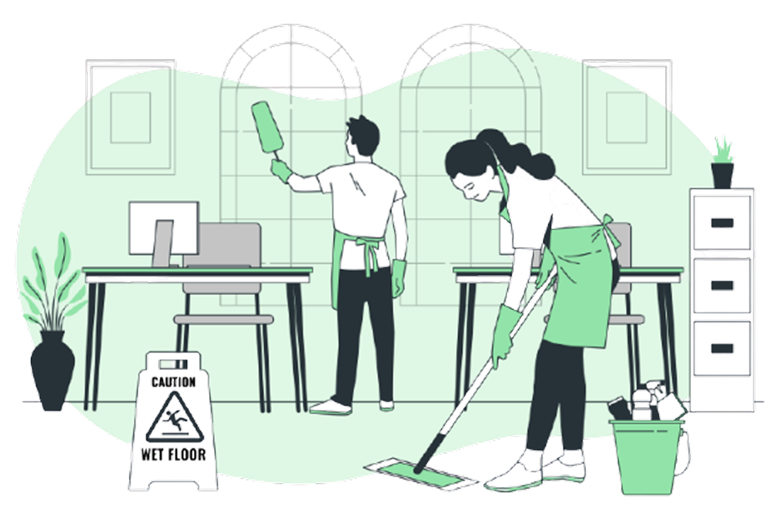 Floor Cleaning Vacuuming or sweeping carpets and rugs to remove dirt and debris. Mopping and sanitizing hard floors, such as tile, hardwood, or laminate. Polishing and buffing floors to maintain a clean and professional appearance.